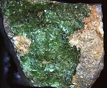 La lindgrenite est un minéral rare de molybdate de cuivre de formule : Cu3(MoO4)2(OH)2. Elle se présente sous forme de cristaux tabulaires à lamellaires monocliniques verts à jaune-vert[2].