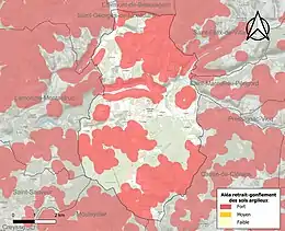 Les mouvements de terrains susceptibles de se produire sur la commune sont des tassements différentiels[40]. Le retrait-gonflement des sols argileux est susceptible d'engendrer des dommages importants aux bâtiments en cas d’alternance de périodes de sécheresse et de pluie[41]. 55,4 % de la superficie communale est en aléa moyen ou fort (58,6 % au niveau départemental et 48,5 % au niveau national métropolitain)[Carte 4]. Depuis le , en application de la loi ÉLAN, différentes contraintes s'imposent aux vendeurs, maîtres d'ouvrages ou constructeurs de biens situés dans une zone classée en aléa moyen ou fort[Note 5],[42].