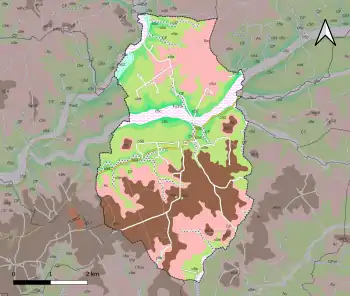 L'occupation des sols de la commune, telle qu'elle ressort de la base de données européenne d’occupation biophysique des sols Corine Land Cover (CLC), est marquée par l'importance des forêts et milieux semi-naturels (63 % en 2018), une proportion sensiblement équivalente à celle de 1990 (62,1 %). La répartition détaillée en 2018 est la suivante : forêts (63 %), prairies (21,6 %), terres arables (7,4 %), zones agricoles hétérogènes (6,1 %), mines, décharges et chantiers (1,9 %)[31]. L'évolution de l’occupation des sols de la commune et de ses infrastructures peut être observée sur les différentes représentations cartographiques du territoire : la carte de Cassini (XVIIIe siècle), la carte d'état-major (1820-1866) et les cartes ou photos aériennes de l'IGN pour la période actuelle (1950 à aujourd'hui)[Carte 3].