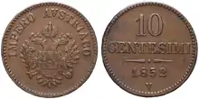 Pièce de 10 centesimi (1852), en cuivre, recto/verso : les aigles impériaux remplacent les armes du royaume.