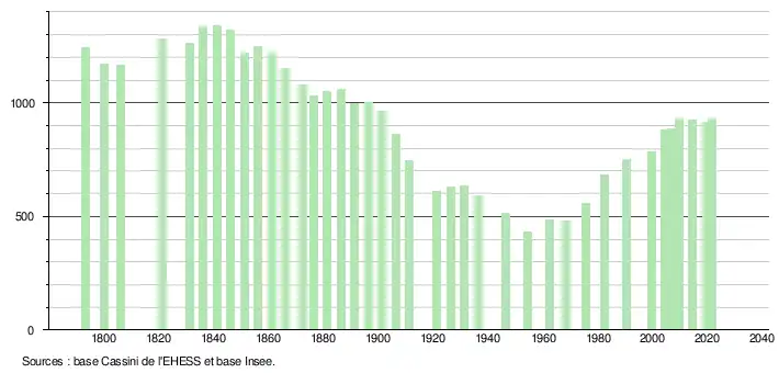 L'évolution du nombre d'habitants est connue à travers les recensements de la population effectués dans la commune depuis 1793. Pour les communes de moins de 10 000 habitants, une enquête de recensement portant sur toute la population est réalisée tous les cinq ans, les populations légales des années intermédiaires étant quant à elles estimées par interpolation ou extrapolation[28]. Pour la commune, le premier recensement exhaustif entrant dans le cadre du nouveau dispositif a été réalisé en 2004[29].