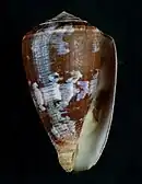 - Cône pourpré : il vit dans les eaux chaudes des régions tropicales. Il possède une trompe qui lui permet d’envoyer une fléchette recouverte de venin constitué de nombreuses toxines différentes, elles peuvent tuer un homme en causant une paralysie respiratoire[6].