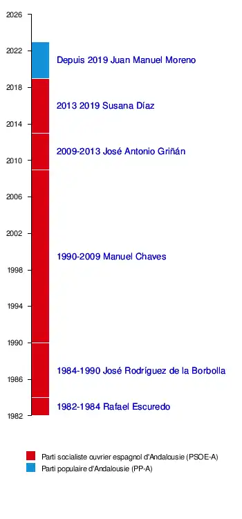 | Manuel Chaves | PSOE-A | – (18 ans, 8 mois et 12 jours) |