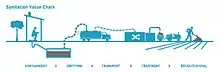 Illustration de la chaine de l'assainissement, des toilettes à la réutilisation en passant par la vidange, le transport et le traitement[1].