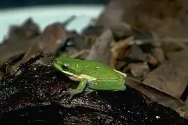 Cette grenouille arboricole est de couleur variable (selon la température et la couleur du milieu environnant), de beige à vert clair sur le dessus, avec parfois de petites taches noires sur le dos. Une ligne blanche débute sous les yeux et rejoint le ventre blanc. Une ligne brune commence au niveau de la narine et se continue jusqu'à l'œil puis entre le vert (ou beige) et blanc du haut et du bas du corps. Cette espèce possède des ventouses au niveau des doigts qui ne sont que légèrement plus grandes que les doigts et les doigts sont palmés aux trois quarts. Certains individus ont la partie postérieure de la cuisse orange.