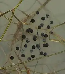 Elle se reproduit dans les retenues d'eau qui ont beaucoup de roseaux ou d'autres végétaux émergents, souvent dans des eaux temporaires. Environ 200-300 œufs sont pondus à chaque amplexus et chaque bouquet d'œufs peut contenir jusqu'à 35 œufs. Le têtard a une durée de vie minimum de 118 jours, à une température de 20 °C. La métamorphose se produit de janvier à mars, les jeunes grenouilles ressemblent à des adultes mais sont très petites et font seulement 9 à 13 mm de longueur.