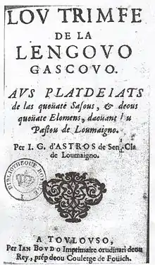 Les lettres béarnaises et gasconnes ont connu une Renaissance au XVIe siècle poussée par le mouvement général de la culture occidentale et dans le contexte de la Réforme. C'est le linguiste et critique gascon Pierre Bec qui a qualifié la période allant de 1550 à 1650 de Siècle d'or de la poésie gasconne[22]. Le grand auteur et principal initiateur de cette période fut Pey de Garros (ca 1525 - ca 1583) ; les deux cours principales qui la virent s'épanouir furent Nérac et Pau avant tout : les deux cours de la maison d'Albret, celle de la reine de Navarre Jeanne d'Albret, instauratrice du calvinisme dans ses états.