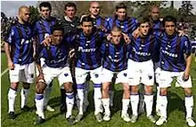 - Maillot domicile : Maillot bleu avec des rayures verticales noires, short et chaussettes noires.