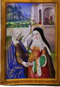 Visitation | Bristol City Museum and Art Gallery, Cote K 2407. | Heures de la Vierge (laudes). La Vierge est accueillie par Élisabeth, richement vêtue, au pied d'un palais avec plusieurs personnages sur une estrade, dont Joachim et Joseph. Marie et Élisabeth sont visiblement enceintes. Le tout compose un ensemble fermé par un mur. Derrière, une campagne avec des champs cultivés, une bâtisse dans le lointain. |