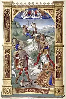 Les miniatures à pleine page sont encadrées d'éléments architecturaux massifs (des pilastres, plus rarement des colonnes engagées) peints en or, surmontés d'une frise à motif de fleurons. Chaque encadrement vertical abrite deux niches superposées, couronnées d'entrelacs finement élaborés, où sont logés, en grisaille dorée sur fond brun, des personnages qui illustrent, voire complètent la scène centrale. Par exemple, dans l'Annonce aux bergers (fol. 39 verso), quatre paysans animent les pilastres : deux femmes portent des outils (une sorte de pelle à long manche et une quenouille), un homme tient une cornemuse et un autre fait un geste de surprise. Tous lèvent les yeux au ciel, vers les trois anges qui, au sommet de la composition principale, chantent la naissance du Christ.
