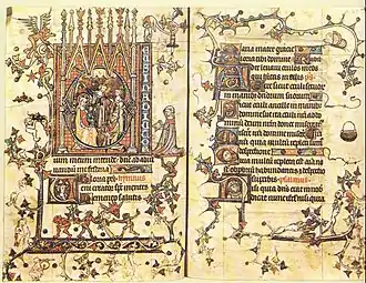 Les lettrines illustrées avec des losanges dorés ornent les pages avec des bordures en forme de lierre stylisé et de piliers ponctuées de personnages grotesques et d'autres figures de drôleries.