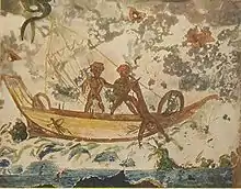 Jonas monte dans un bateau, puis descend dans la cale et s'endort. Le navire est pris dans une grande tempête. Les marins prient vainement chacun à l'adresse de sa propre divinité puis jettent les sorts afin de découvrir la cause de ce malheur, et les sorts désignent Jonas plongé alors dans un profond sommeil au fond d'une cale. L’équipage interroge leur passager qui affirme son identité comme « Hébreu » (‘ivri) et « leur propose de lui même qu’on le précipite dans l’eau afin de calmer les flots impétueux »[1]. Il est lancé à la mer, qui se calme aussitôt.