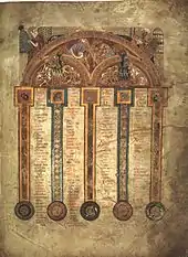 L'unité des Évangiles est encore renforcée par la décoration des tables canoniques d'Eusèbe de Césarée. Les tables elles-mêmes sont conçues pour établir l'unité des quatre textes en permettant au lecteur d'identifier des passages équivalents dans chaque Évangile, et requièrent normalement douze pages. Les copistes du Livre de Kells avaient bien réservé douze pages à cette besogne (folios 1v à 7r) mais, pour une raison inconnue, finirent par condenser les tables en dix pages seulement, laissant ainsi deux pages blanches (les folios 6v et 7r). Ce resserrement rendit les tables confuses et inutilisables. La décoration des huit premières pages des tables canoniques semble fortement influencée par des manuscrits plus anciens de la région méditerranéenne, où la coutume était d'insérer les tables dans le dessin d'une arcade[36]. Les moines travaillant au Livre de Kells emploient ce style, mais en y apportant leur propre esprit : les arcades ne sont plus considérées comme des éléments architecturaux mais plutôt comme des motifs géométriques, décorés de motifs ornementaux typiquement insulaires. Les quatre symboles des évangélistes occupent l'espace au-dessus et au-dessous des arcs. Les deux dernières pages, quant à elles, représentent les tables dans une grille, ce qui est plus conforme à la tradition des manuscrits insulaires, comme dans le Livre de Durrow[38]. Ces tables ont été rapprochées de celles d'un manuscrit carolingien contemporain au livre de Kells, le Codex Aureus Harley[43]. Cependant, des tables identiques ont été observées dans un manuscrit anglais du VIIIe siècle (British Library, Royal 7 C XII)[44].