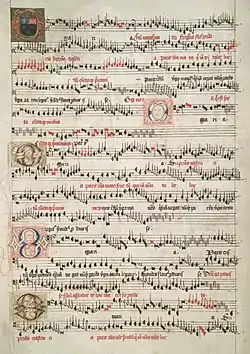 Lorsqu'il contient de la musique polyphonique, toutes les voix sont disposées côte à côte (superius et tenor à gauche, altus et bassus à droite, en général). Cette disposition génère une contrainte particulière quand une pièce est notée sur plusieurs pages : au moment de tourner la page, les voix doivent arriver en même temps en fin de page (ceci demande un soin particulier au copiste ou à l'imprimeur).