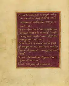 (Accepte, sublime Roi des rois, cet humble petit livre, digne de notre vénération pour vous, que j'ai écrit en or, et orné de diverses images, parce que mon cœur brûle de tout amour pour vous. C'est pourquoi je vous salue à genoux avec d'humbles paroles et prie qu'il t'apporte salut et puissance durable ta vie durant, jusqu'à ce que tu sois enlevé chez le Christ dans les étoiles du ciel avec les Rois. »