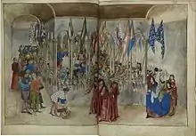 Annonce du tournoi et distribution des écussons aux armes des juges, f.19r.