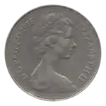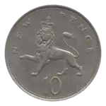 Avers et revers d'une pièce de dix New Pence émise peu après la décimalisation (1975). | ||