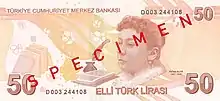 | 50 livres | 68 × 148 mm | Orange | Fatma Aliye (1862 – 1936). Fatma Aliye est la première femme philosophe de Turquie. C'est aussi une des premières femmes écrivains du pays. Elle prit le pseudonyme « Topuz » en 1934. | ||||||