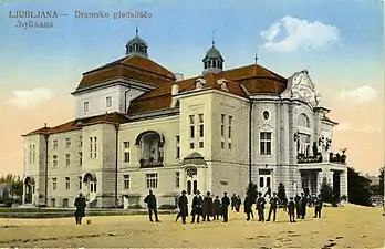 Il s'agit d'un bâtiment art nouveau qui abritait à l'origine le théâtre allemand de la ville (allemand : Deutsches Theater)[1] : l’édifice fut construit entre 1909 et 1911, selon les plans de l’architecte viennois Alexander Graf (de) qui projeta plusieurs théâtres pour la communauté allemande de Tchéquie. Le théâtre de Ljubljana est la copie du théâtre que Graf édifia à Ústí nad Labem[2].