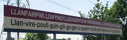 Le gallois Llanfairpwllgwyngyllgogerychwyrndrobwllllantysiliogogogoch, également transcrit Llan-vire-pooll-guin-gill-gog-er-u-queern-drob-ooll-lan-dus-ilio-gogo-goch, qui indique sa prononciation approximative en anglais, et dont la traduction littérale en anglais est « The church of Mary in the hollow of the white hazel near the fierce whirlpool and the church of Tysilio by the red cave », signifie « l'église de sainte Marie dans le creux du noisetier blanc près du tourbillon rapide et l'église de saint Tysilio près de la grotte rouge ».