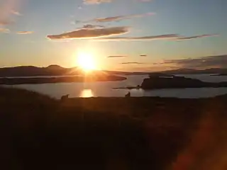 Point de vue vers le nord-ouest à Fiskavaig : loch Bracadale au premier plan et, vers le large, les îles d'Oronsay, de Wiay, de Tarner et d'Harlosh.