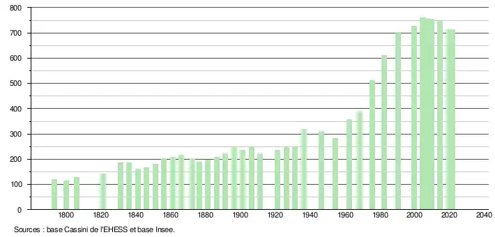 L'évolution du nombre d'habitants est connue à travers les recensements de la population effectués dans la commune depuis 1793. Pour les communes de moins de 10 000 habitants, une enquête de recensement portant sur toute la population est réalisée tous les cinq ans, les populations légales des années intermédiaires étant quant à elles estimées par interpolation ou extrapolation[25]. Pour la commune, le premier recensement exhaustif entrant dans le cadre du nouveau dispositif a été réalisé en 2004[26].