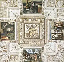 Sous chaque voûte, il y a quatre « histoires » à fresque entourées de cadres en stuc de formes variées (hexagonales, rectangulaires ou nervurées), tandis qu'aux angles se trouvent des grotesques ou des décorations architecturales ; des armoiries se trouvent au centre des voûtes : dans celle centrale, l'emblème du pape Léon X avec les clés de saint Pierre, et dans toutes les autres, des victoires ou des génies du jeu, l'insigne personnel de Giovanni de' Medici avant de devenir pape[1].