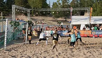 Le ballon doit être placé dans un quart de cercle imaginaire d’1 m de rayon, ayant pour centre le pied du drapeau de coin le plus proche de l’endroit où le ballon a franchi la ligne de but. Le joueur qui effectue le coup de pied de coin peut former un petit monticule de sable avec le ballon ou avec les pieds afin de surélever le ballon.