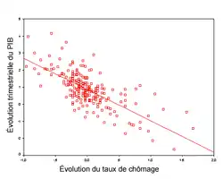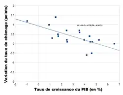 Toutefois, les valeurs de la loi d'Okun ont nettement changé en France durant la période récente, rejoignant celles des États-Unis. Ainsi, Olivier Blanchard et Daniel Cohen estiment que le coefficient d'Okun n'était, en France, que de 0,17 au cours des années 1960 et 1970, contre 0,40 de 1981 à 2000[6]. Les graphiques ci-dessous, fondés sur un découpage temporel partiellement différent, donnent des valeurs proches : le coefficient vaudrait 0,19 de 1970 à 1989 tandis qu'il serait aujourd'hui de 0,57.