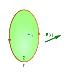 Un circuit électrique, représenté par un contour C orienté arbitrairement, soumis à un flux magnétique Φ variable (issu d'un champ magnétique variable) est le siège d'une force électromotrice e telle que[1] :