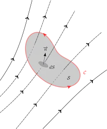 • Φ est le flux magnétique variable. Il est donc tel que : , avec S la surface délimitée par le contour C, et le vecteur unitaire normal à la surface élémentaire dS et orienté selon la règle du tire-bouchon de Maxwell.