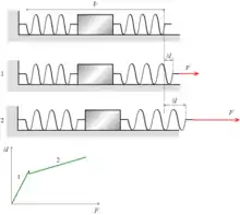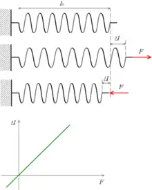 Le cas le plus simple de la déformation élastique est celui du ressort à boudin sollicité modérément dans son axe, en allongement ou en compression ; dans ce cas, la force est proportionnelle à l'allongement relatif, soit à une dimension :