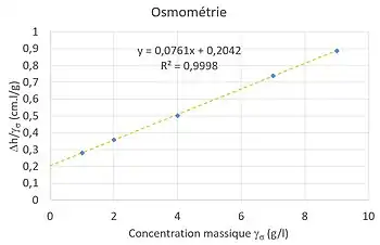 - On trace le graphe , on obtient une droite de pente positive que l'on extrapole à (voir Figure 3). L'ordonnée à l'origine ainsi déterminée vaut = 0,21 cm·l/g, d'où l'on déduit que = 1,2 × 105 g/mol.