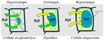 - si les concentrations de part et d'autre de la membrane sont égales, la pression osmotique est nulle et il n'y a pas d'osmose ; le milieu A est dit isotonique par rapport au milieu B ;