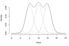 La question de la multimodalité est simple pour certains cas, tels que des mélanges de lois exponentielles : tous ces mélanges sont uni-modaux[3]. Cependant, pour le cas des mélanges de lois normales, la question est complexe. Les conditions pour le nombre de modes dans un mélange normale multivariée ont été observés par Ray et Lindsay[4] étendant les travaux antérieurs sur l’uni-variété[5],[6] et les lois multivariées (Carreira-Perpinan et Williams, 2003).