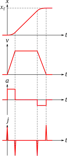 Une telle loi n'est pas possible au sens strict : en effet, la discontinuité de l'accélération génère un à-coup infini. L'élasticité du mécanisme va donc limiter la variation de l'accélération d'une part, le mouvement réel aura donc du retard par rapport au mouvement planifié. D'autre part, ce fonctionnement va générer des vibrations importantes.