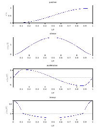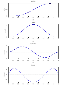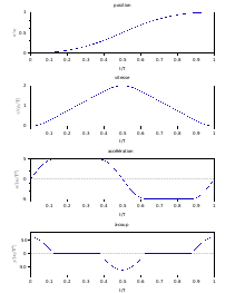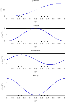 Les conditions initiales et finales imposent six conditions : x(0) = 0, v(0) = 0, a(0) = 0, x(T) = xf, v(T) = 0, a(T) = 0. La fonction x(T) est donc au minimum d'un polynôme de degré cinq :