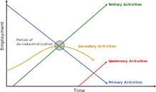 Les secteurs primaire et secondaire sont de plus en plus dominés par l'automatisation et la demande de main-d'œuvre baisse dans ces secteurs. Il est remplacé par les demandes croissantes du secteur tertiaire. La situation correspond maintenant aux sociétés industrielles modernes et à la société du futur, au service ou à la société post-industrielle. Aujourd'hui, le secteur tertiaire a pris une telle ampleur qu'il est parfois divisé en un secteur quaternaire fondé sur l'information et même en un secteur quinaire fondé sur les services à la personne.