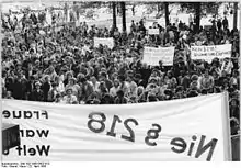 Dans la République fédérale, la nouvelle version de la législation de la RDA concernant l'avortement encourage la coalition sociale-libérale du chancelier fédéral Willy Brandt et du ministre de la justice Gerhard Jahn dans ses efforts de réforme de l'article 218 du Code pénal allemand. Ainsi, en , une réglementation de l'avortement comparable à celle de RDA est adoptée pour remplacer la réglementation initiale basée sur l'indication médicale, planifiée et restreinte[34],[35]. Après que les membres du groupe parlementaire CDU/CSU et les cinq gouvernements des Länder aient intenté une action auprès de la Cour constitutionnelle, cette nouvelle réglementation est déclarée anticonstitutionnelle par la Cour constitutionnelle fédérale en [36]. Elle est remplacée en par une réglementation autorisant l’avortement dans quatre cas, dont l'indication pour raisons sociales, qui est de nouveau acceptée en plus des exceptions déjà autorisées précédemment[34],[37]. Après la réunification allemande, la loi du 27 juillet 1992 relative à l'éducation sexuelle, à la contraception et au planning familial[38] permet l’apparition d’une loi sur l’interruption volontaire de grossesse avec obligation de conseil et autorisations d’avortement. Celle-ci est la nouvelle version fédérale des dispositions légales concernant l'avortement et représente un compromis entre le régime du délai en RDA et l'avortement légalement autorisé en République fédérale. Après un recours devant la Cour constitutionnelle fédérale[39], cet amendement entre finalement en vigueur en 1995[40].