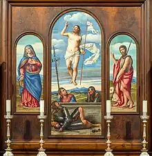 Résurrection, par Bernardino Licinio, dans la Basilica di San Giovanni Battista (Lonato del Garda) (it). À gauche la Vierge Marie à droite saint Jean Baptiste. Juin 2023.