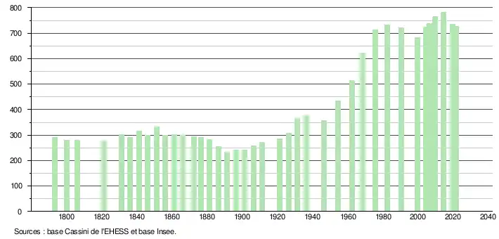 L'évolution du nombre d'habitants est connue à travers les recensements de la population effectués dans la commune depuis 1793. Pour les communes de moins de 10 000 habitants, une enquête de recensement portant sur toute la population est réalisée tous les cinq ans, les populations légales des années intermédiaires étant quant à elles estimées par interpolation ou extrapolation[21]. Pour la commune, le premier recensement exhaustif entrant dans le cadre du nouveau dispositif a été réalisé en 2004[22].
