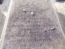 Louis-Ferdinand Destouches meurt à son domicile de Meudon le , vraisemblablement des suites d'une athérosclérose cérébrale[125] — bien que d'autres pathologies soient parfois évoquées[11] — laissant veuve Lucette Destouches. Il est enterré discrètement au cimetière des Longs Réages, à Meudon le en présence de sa fille Colette Destouches, de Roger Nimier, Marcel Aymé, Claude Gallimard, Max Revol, Jean-Roger Caussimon, Renée Cosima et Lucien Rebatet et des journalistes André Halphen et Roger Grenier[126] ; ses lettres et manuscrits[127], sont détruits en à la suite de l'incendie du pavillon qu'il occupait.