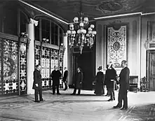 La Maison-Blanche : En 1881, à la demande du président Chester Alan Arthur, Tiffany a entrepris un projet de rénovation majeur de la Maison-Blanche. À cette époque, il était déjà en train de se forger une réputation dans la société new-yorkaise grâce à ses compétences en décoration d'intérieur. Le président Arthur a confié à Tiffany la responsabilité de réaménager l'ensemble des salons d'apparat, qu'il considérait comme dépourvus de charme. Tiffany a supervisé la rénovation de plusieurs espaces, notamment la salle Est, la salle bleue, la salle rouge, la salle à manger d'État et le hall d'entrée. Ces rénovations comprenaient le réaménagement des espaces, la création de motifs décoratifs, l'installation de nouvelles cheminées, l'utilisation de motifs de papier peint plus denses, ainsi que l'ajout de vitraux Tiffany aux luminaires et aux fenêtres à gaz. Un écran de verre opalescent du sol au plafond a également été intégré dans le hall d'entrée. Cependant, lors des rénovations de 1902 sous la présidence de Theodore Roosevelt, le paravent Tiffany et d'autres éléments de style victorien ont été retirés, et les intérieurs de la Maison-Blanche ont été restaurés dans un style fédéral, en harmonie avec son architecture d'origine[42].