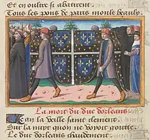 Le , un groupe d'hommes de mains sous la conduite de Raoul d'Anquetonville, s'embusque dans une hôtellerie et assassine Louis d'Orléans en chemin vers l'hôtel Saint-Pol, où il a été appelé pour un faux motif par le valet du roi Thomas de Courteheuse, alors que Louis venait de rendre visite à la reine Isabeau de Bavière dans l'hôtel Barbette. Sa dépouille est déposée, avant les funérailles, dans l'église Notre-Dame-des-Blancs-Manteaux[3]