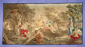 - Ensemble de sujets mythologiques tissés d'après six peintures, acquises par l'administration royale pour la manufacture d'Aubusson, 1759[30] :