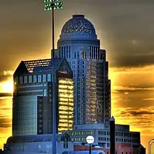 En 2008, la ville totalise neuf gratte-ciel dont la hauteur dépasse les 100 m. Le plus grand, nommé AEGON Center, atteint 167 m de hauteur[22]. Ce gratte-ciel qui tient le haut du classement depuis 1993 aurait perdu son titre en 2010 si le projet de construction du Museum Plaza n'avait pas été abandonné. Ce dernier aurait dû culminer à 212 m. La plupart de ces immeubles sont situés dans le quartier des affaires de Downtown Louisville. Ce quartier, à l'emplacement originel de la ville de Louisville, est le plus grand quartier des affaires de l'État du Kentucky. Après un certain exode de la population consécutif à la Seconde Guerre mondiale, le quartier a connu un renouveau depuis les années 1970. Il fut longtemps considéré comme un lieu de travail et non un lieu de résidence. Depuis les années 2000, de nombreux commerces et bâtiments résidentiels sont réapparus dans le quartier en vue d'y faire revenir la population. La construction du stade de baseball Louisville Slugger Field et du parc Waterfront en 1998 participa à son renouveau. En 2007, le Fourth Street Live! fut achevé. Le Muhammad Ali Center et le Kentucky Center sont quelques preuves du renouveau culturel du quartier. Les bâtiments de West Main Street ont une architecture originale avec des façades décorées en fonte[23].