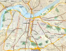 Le Downtown Louisville, le quartier des affaires, est situé au sud de la rivière Ohio et plus précisément au sud-est des chutes de la rivière Ohio. La ville est bien desservie en voies de communication et l'aéroport international de Louisville se situe à environ 10 km au sud de la banlieue sud de la ville. Les zones industrielles se trouvent au sud et à l'ouest de l'aéroport, mais aussi à l'est au niveau du Hurstbourne Parkway[27].