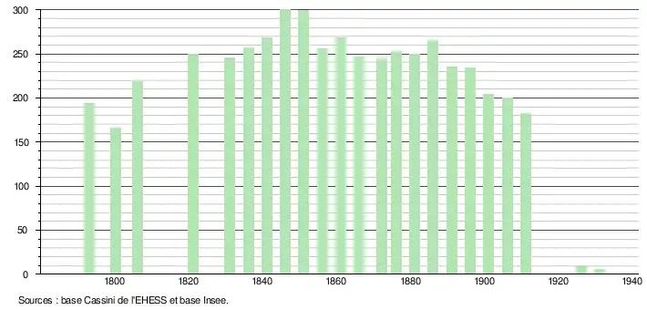 - Dans le tableau des recensements et le graphique, par convention dans Wikipédia, et afin de permettre une comparaison correcte entre des recensements espacés d’une période de cinq ans, le principe a été retenu, pour les populations légales postérieures à 1999 de n’afficher dans le tableau des recensements et le graphique que les populations correspondant aux années 2006, 2011, 2016, etc., ainsi que la dernière population légale publiée par l’Insee.