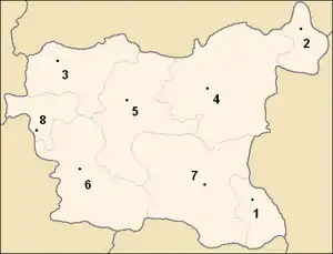 Les noms de localités en caractères gras ont le statut de ville (en bulgare : град, translittéré en grad). Les autres localités ont le statut de village (en bulgare : село translittéré en selo).