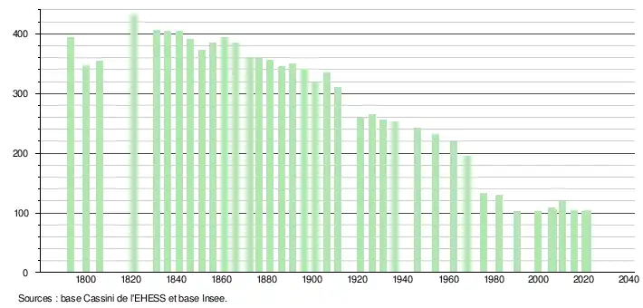 L'évolution du nombre d'habitants est connue à travers les recensements de la population effectués dans la commune depuis 1793. Pour les communes de moins de 10 000 habitants, une enquête de recensement portant sur toute la population est réalisée tous les cinq ans, les populations légales des années intermédiaires étant quant à elles estimées par interpolation ou extrapolation[30]. Pour la commune, le premier recensement exhaustif entrant dans le cadre du nouveau dispositif a été réalisé en 2005[31].